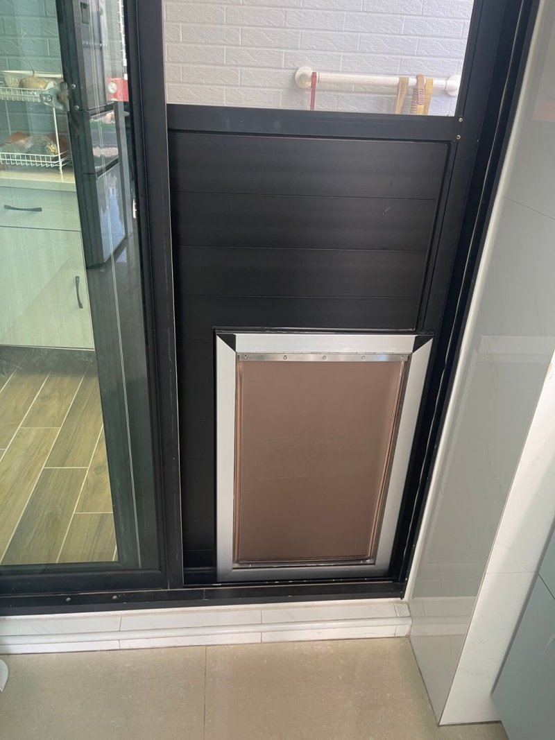 客戶家中養了一對超可愛的巨型貴賓犬,也因如此,便需要在落地窗紗門上安裝巨型狗門,方便寶貝的進出,於是自備了寵物門請人來安裝。