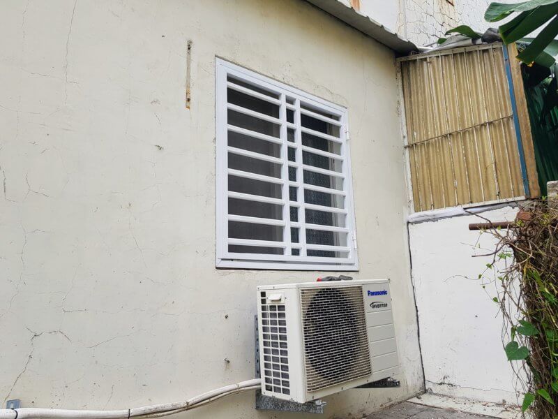 因為房子後方的空地將要興建房屋,為了提升居家安全,施工團隊替業主規劃了一座舊式冷氣窗口用的固定防盜窗與另一座橫拉窗用的可逃生防盜鋁窗。