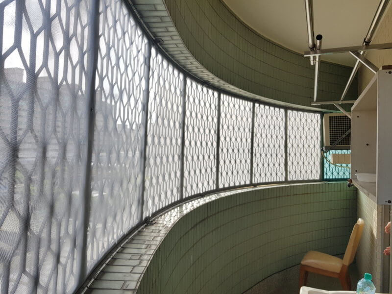 幫先前服務過的客人,在另一間承租房子月牙形陽台的鋁花格防盜窗基礎上,編織防蚊蟲紗網。
