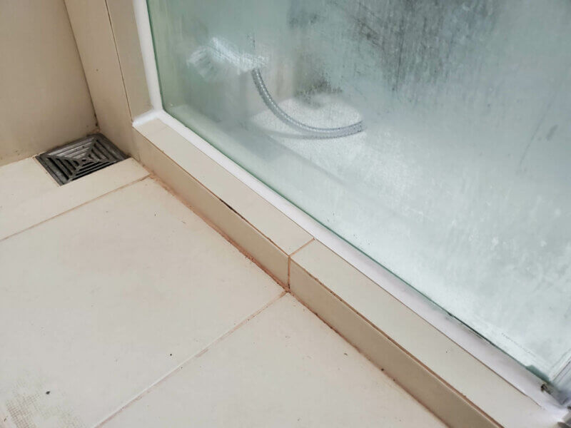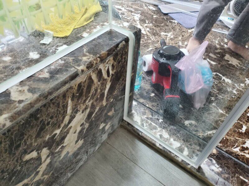 又一戶客戶家中浴廁的乾濕分離無框淋浴拉門有更新止水條與部分發霉矽利康刮除並重新施作的需求。