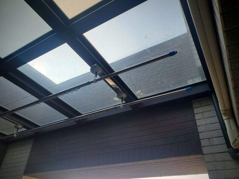 客戶委託好室科技施作的工程有三合一通風門用貓門、貓咪用的隱形寵物防墜網與露臺採光罩的手搖升降曬衣架。