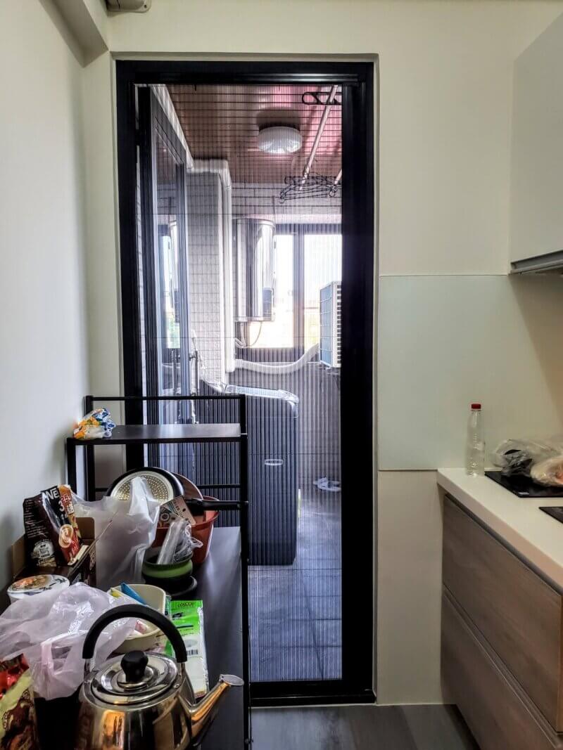 然後是廚房與家事陽台間的摺疊紗門安裝,不像傳統紗窗佔據了一個迴轉空間,左右橫拉式的設計,讓陽台與廚房間的進進出出更加的愜意了。