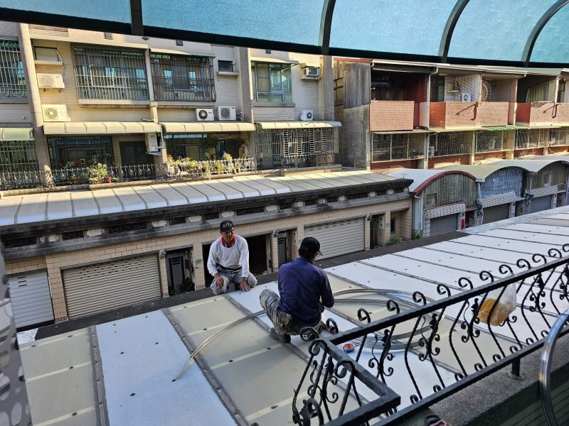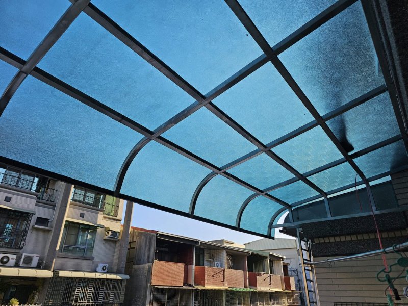 客戶原先用的雨遮與採光罩板材均為PC耐力板,用了十幾二十年,採光罩PC板破裂也差不到了生命週期的汰換階段。考量到採光與晾曬衣物,就決定持續使用透光性好且有一定降溫效果的綠色顆粒PC板。