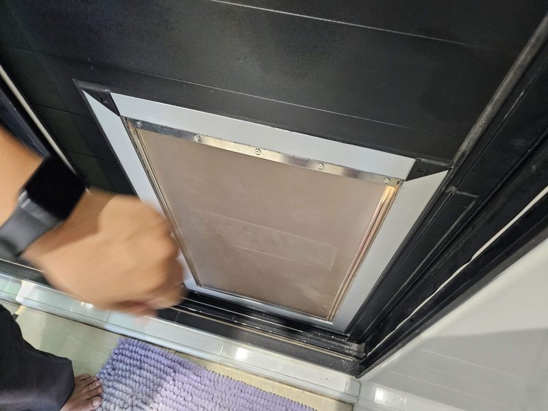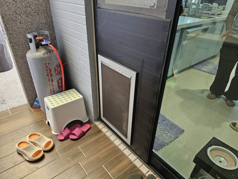 但請來的施工人員不熟稔巨型犬門在紗門上的正確安裝工法,導致落地窗的門片無法關起來,這可真是一個反人類的安裝方式啊!