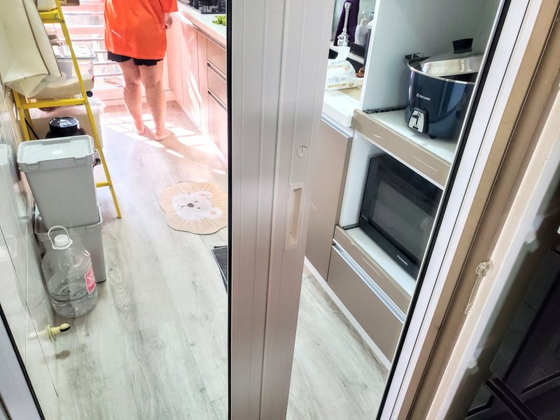從施作鋁框折門後的照片可以知道,廚房的採光十分良好,在我們與業主的討論規畫之下,廚房門與廚房陽台門均採用白色框體搭透明玻璃的配置,讓整個空間十分通透。精實的鋁框結構,輕易地達成微氣密與微隔音的效果,讓家人更離不開日常活動的起居室了!